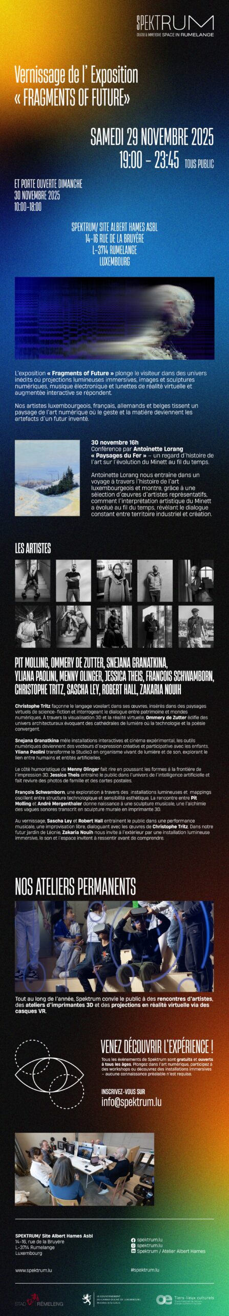 L’exposition « Fragments of Future » plonge le visiteur dans des univers inédits où projections lumineuses immersives, images et sculptures numériques, musique électronique et lunettes de réalité virtuelle et augmentée interactive se répondent.