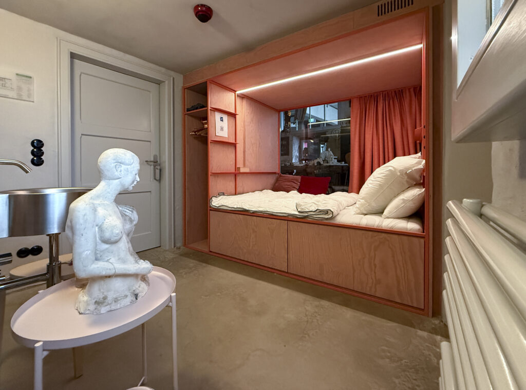 Cette chambre offre une vue directe sur l’atelier préservé du sculpteur Albert Hames. Aménagée pour la contemplation, elle permet aux visiteur·euse·s de découvrir l’espace de travail tel qu’il était en 1989. Un lien sensible et silencieux avec la mémoire du lieu.