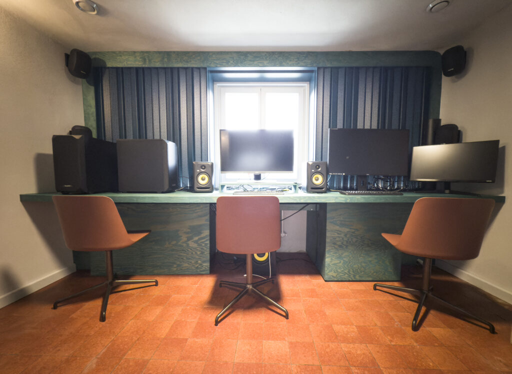 Ce studio sonore est équipé pour accueillir des créations audio, des enregistrements ou des performances. Un lieu technique, mais ouvert à l’improvisation et aux croisements interdisciplinaires. Elle permet aux artistes de tester des formes, des images et des dimensions à grande échelle.